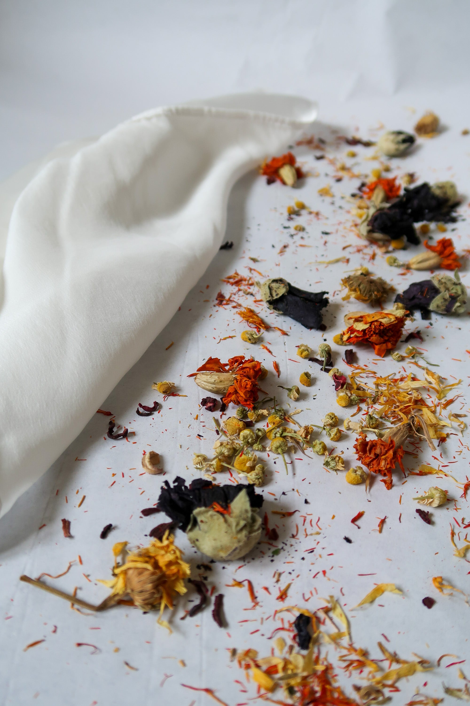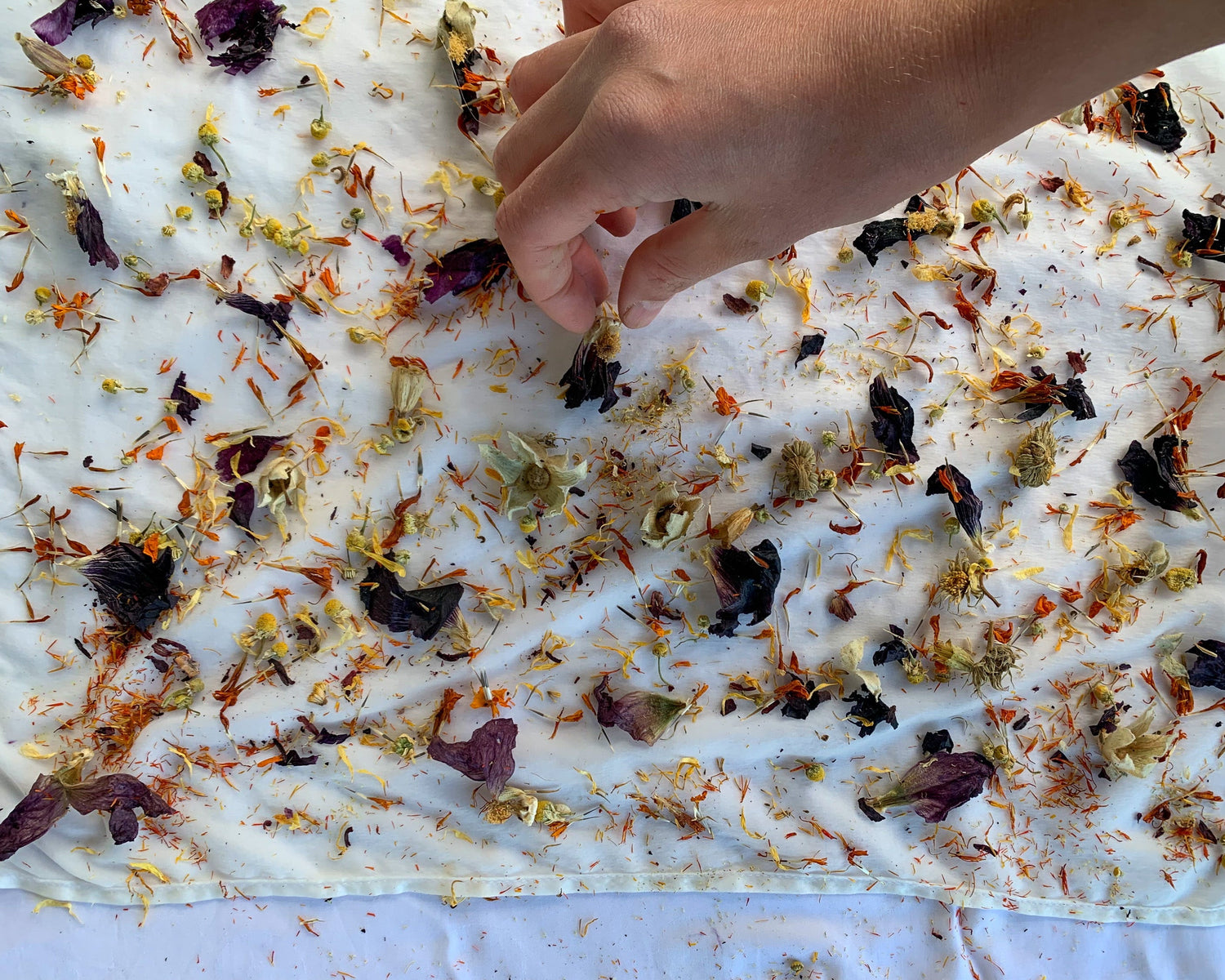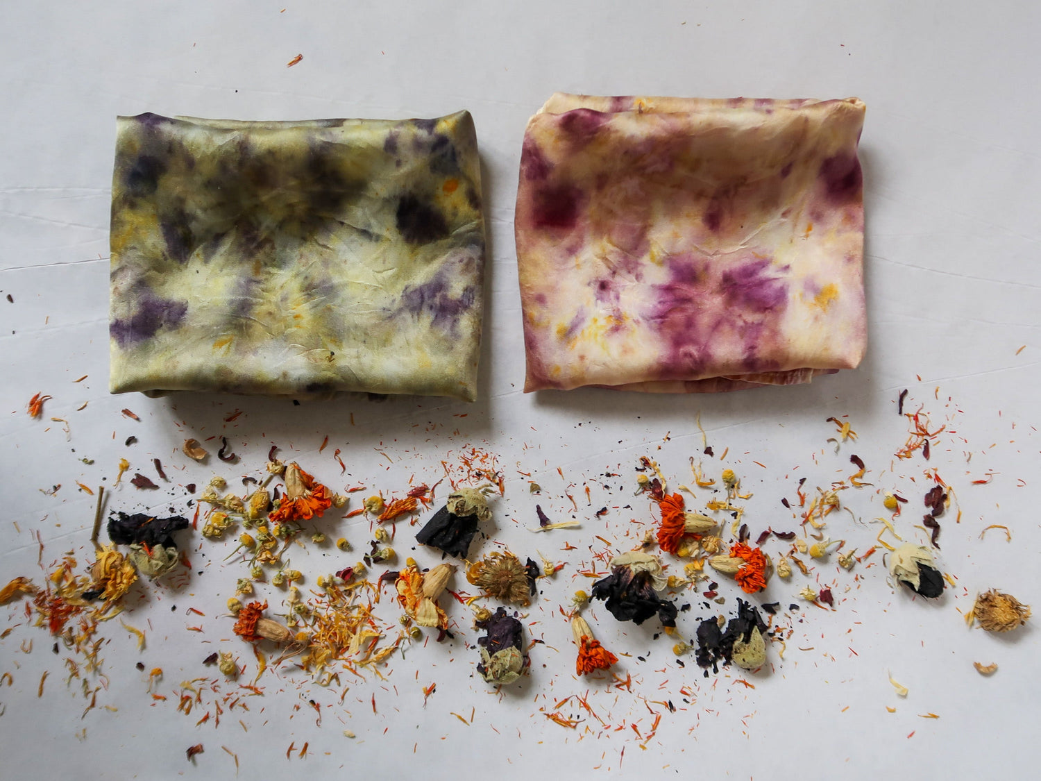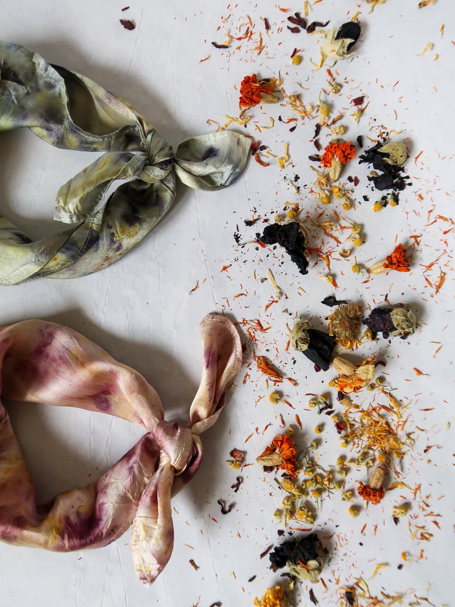 If you prefer to receive all the necessary ingredients as a kit, they are available for delivery here. The kit comes with six varieties of dry flowers, a piece of string, and two color modifiers. You can chose to dye a silk scarf, upcycled scrunchie or bandana.