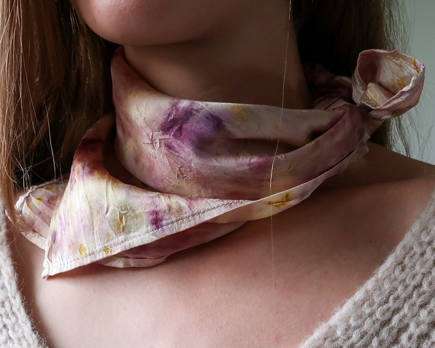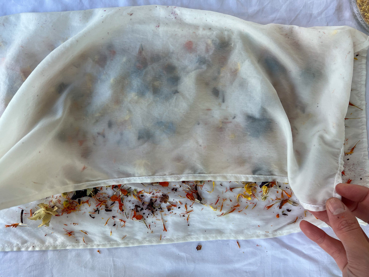 Let the scarf air dry. Carefully remove any kind of leftover plant matter with your fingers. If you want to wash your scarf / scrunchie / bandana, hand wash in lukewarm or cold water using a neutral detergent (like silk or wool detergent). Make sure it’s the same pH as what you used for modifying, either by adding some citric acid/lemon juice/white vinegar OR baking soda/washing soda.