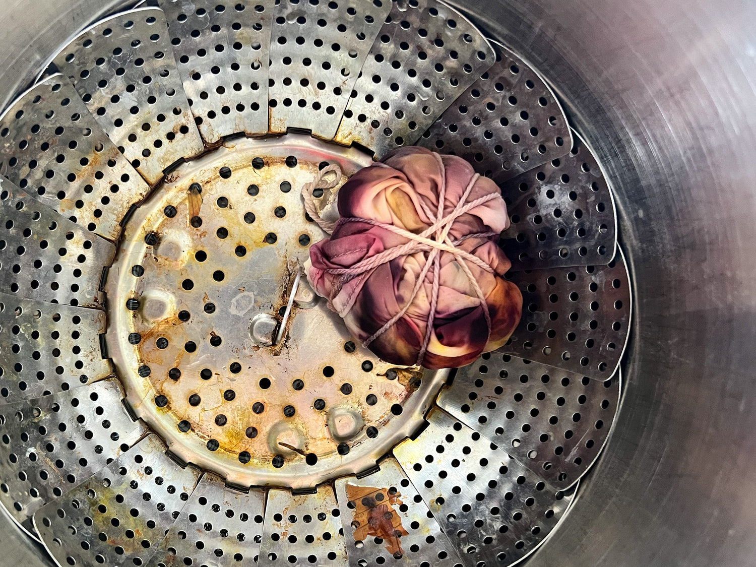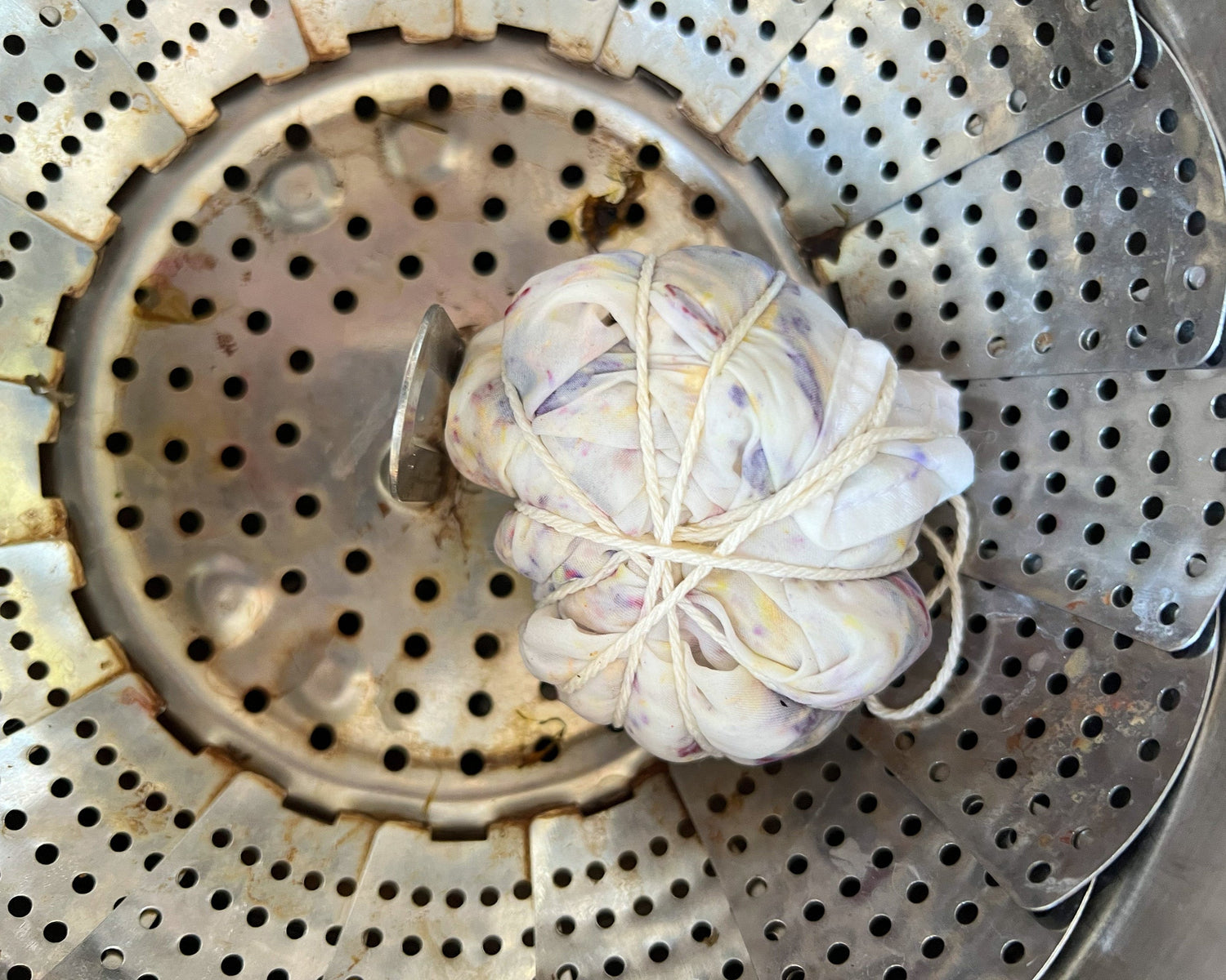 Steam the bundled fabric to activate the natural dyes present in the plants. This process allows the pigments to transfer from the plant material to the fabric, creating unique and unpredictable patterns. Steam between 10-15 minutes.