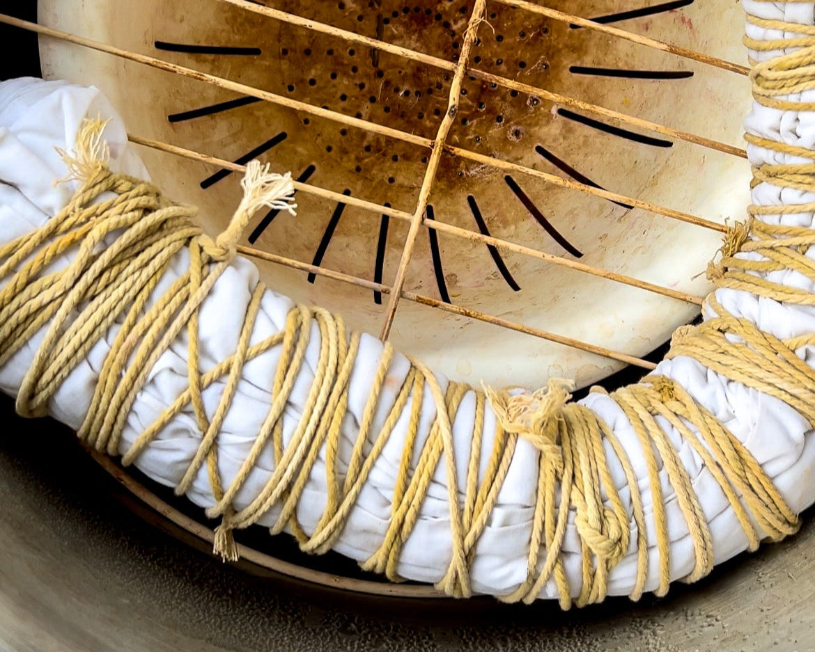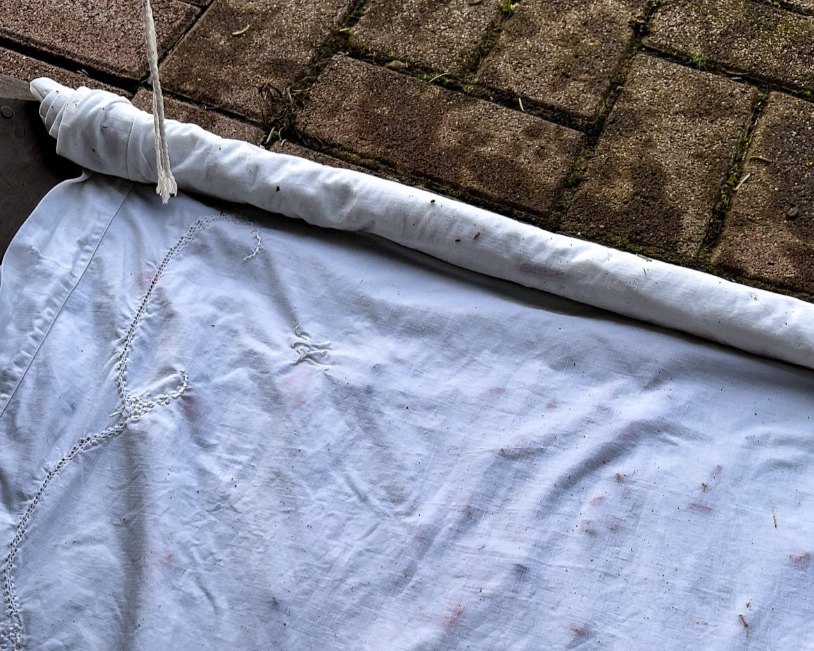 Fold the other half of the table cloth over the dye stuff so that the plant dyes are sort of “sandwiched” between the fabric layers. Then start rolling up the table cloth from one side into a snake shape. Tightly wrap string around the bundle, so that the dye stuff is firmly secured inside.