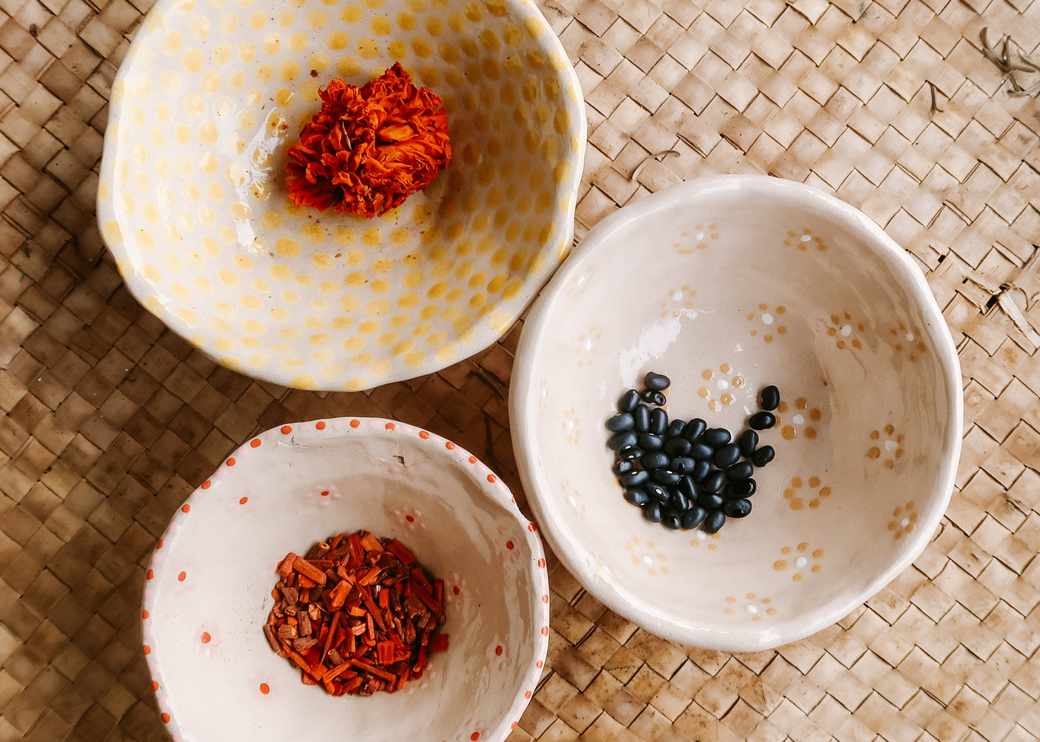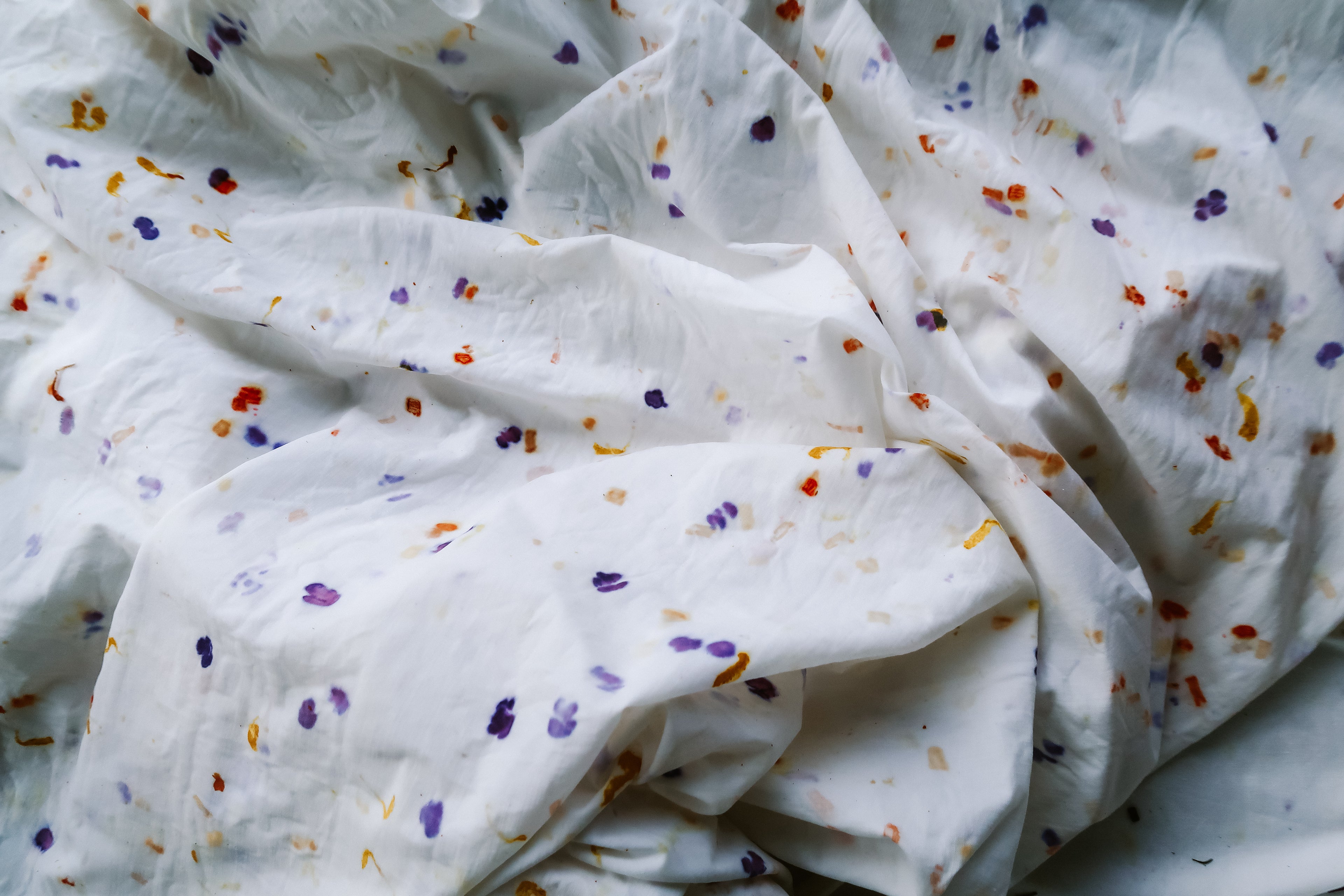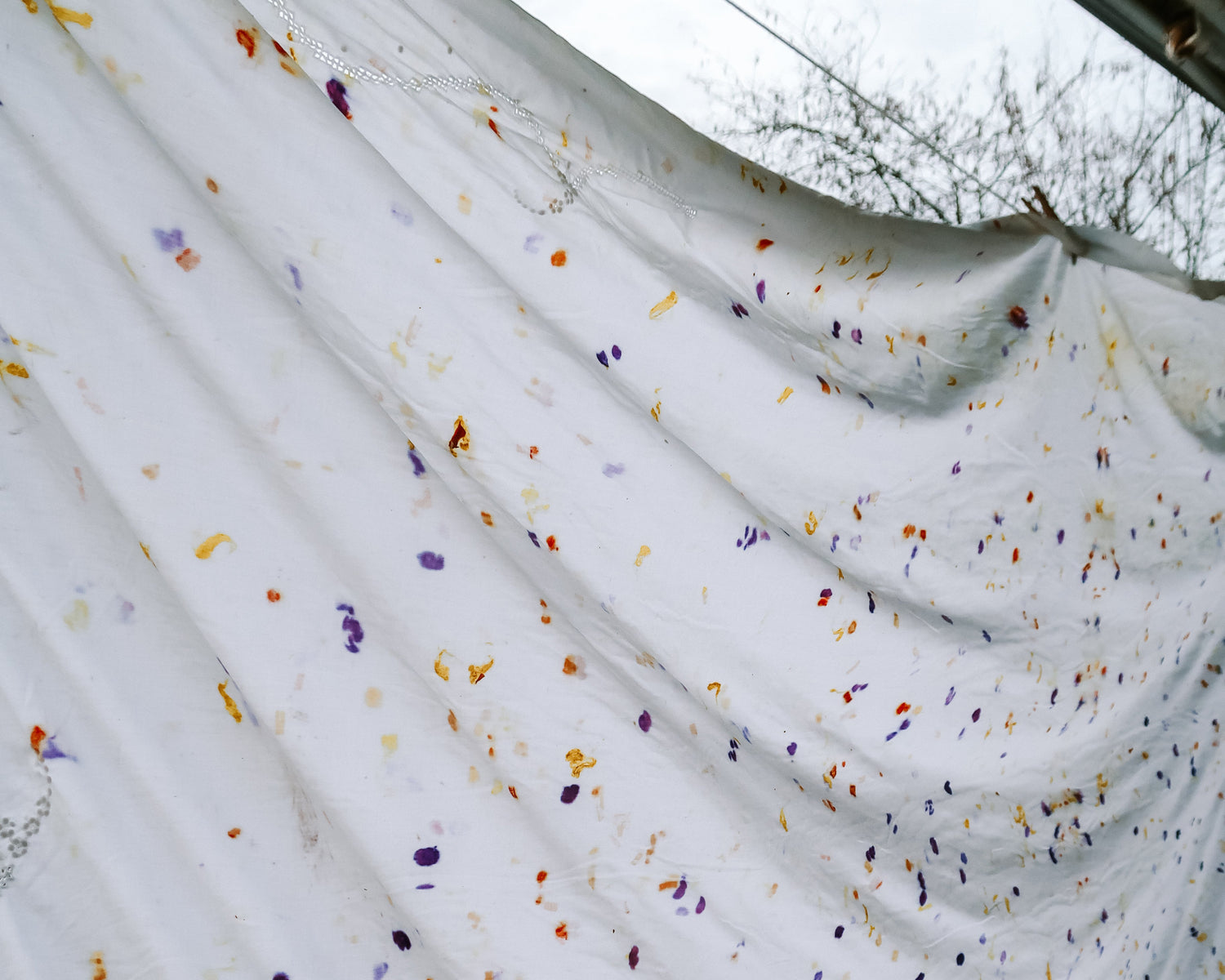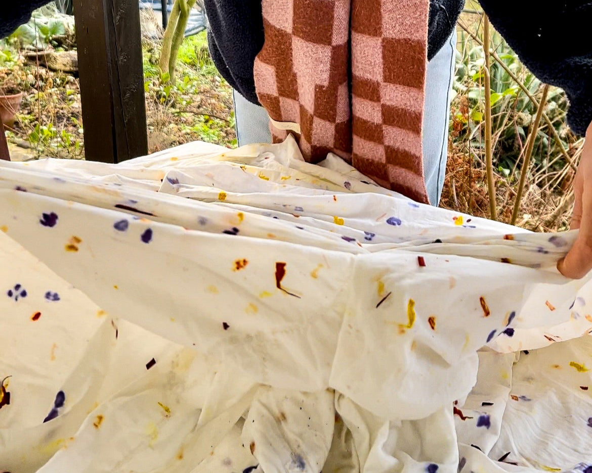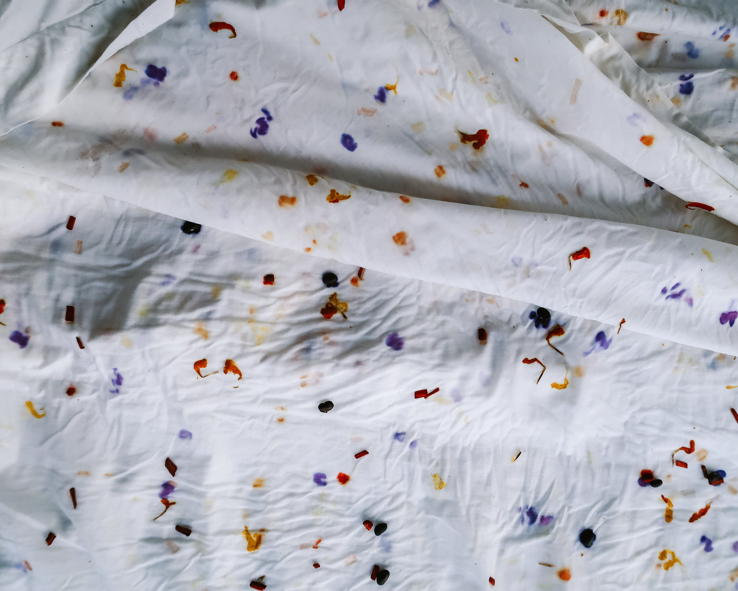 For my daughter’s birthday I naturally dyed an old table cloth with black beans, dried marigolds and madder pieces to create this confetti style look for her birthday table. Bundle dyeing is such an amazing technique and perfect for quick natural dye projects.