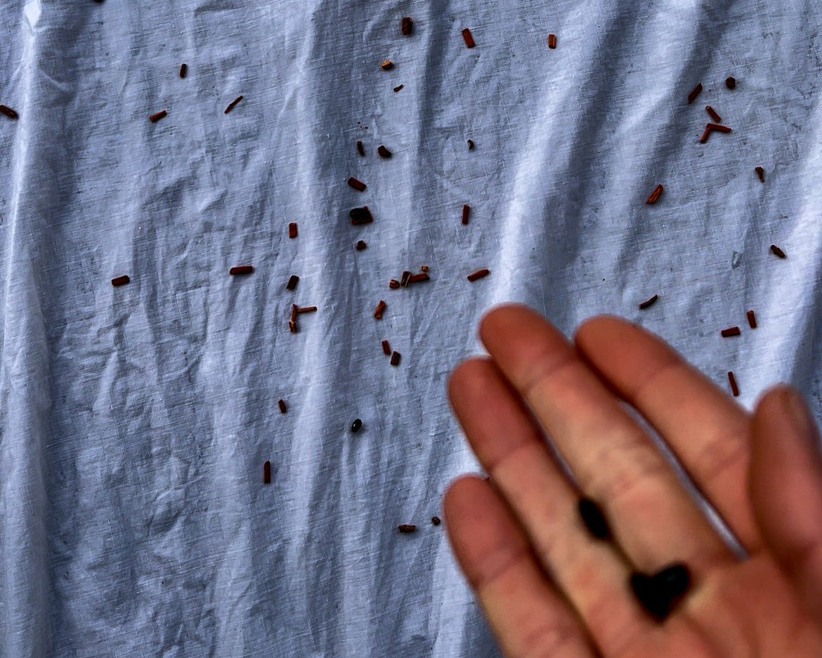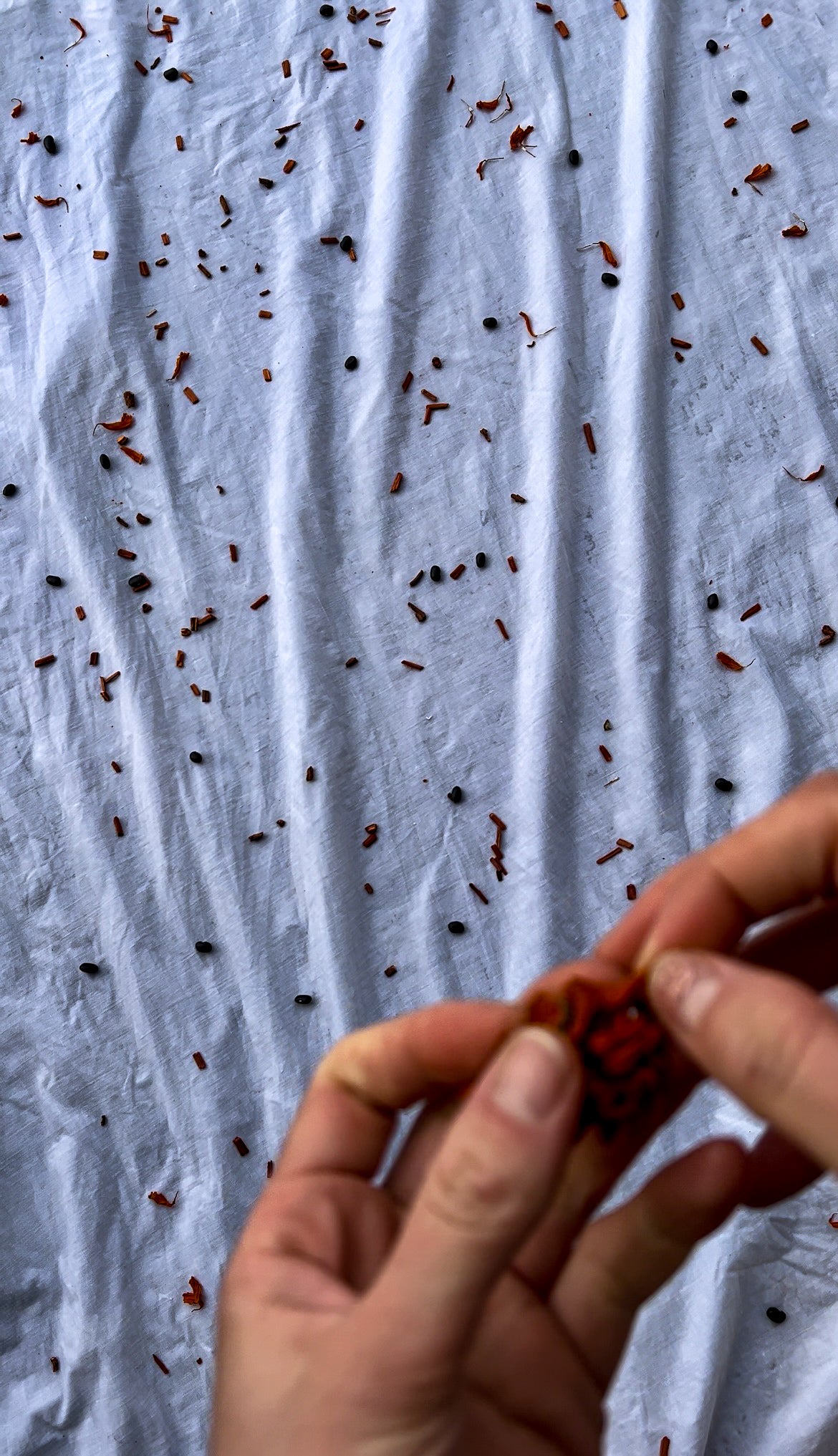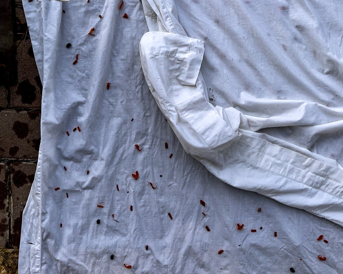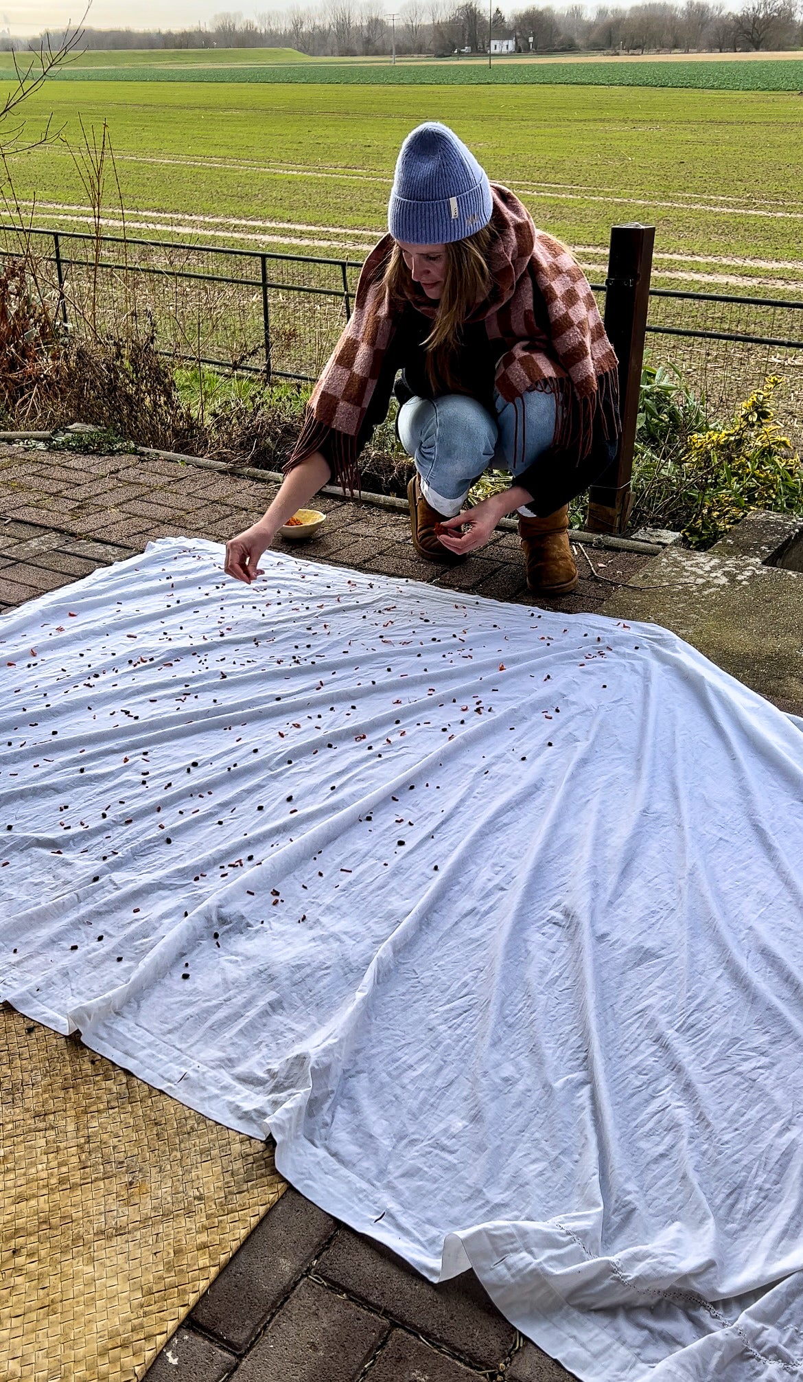 Spread out your damp and mordanted table cloth on the floor and start sprinkling the madder pieces, black beans and marigold petals over half of the table cloth. (Make sure your table cloth is facing right side up).