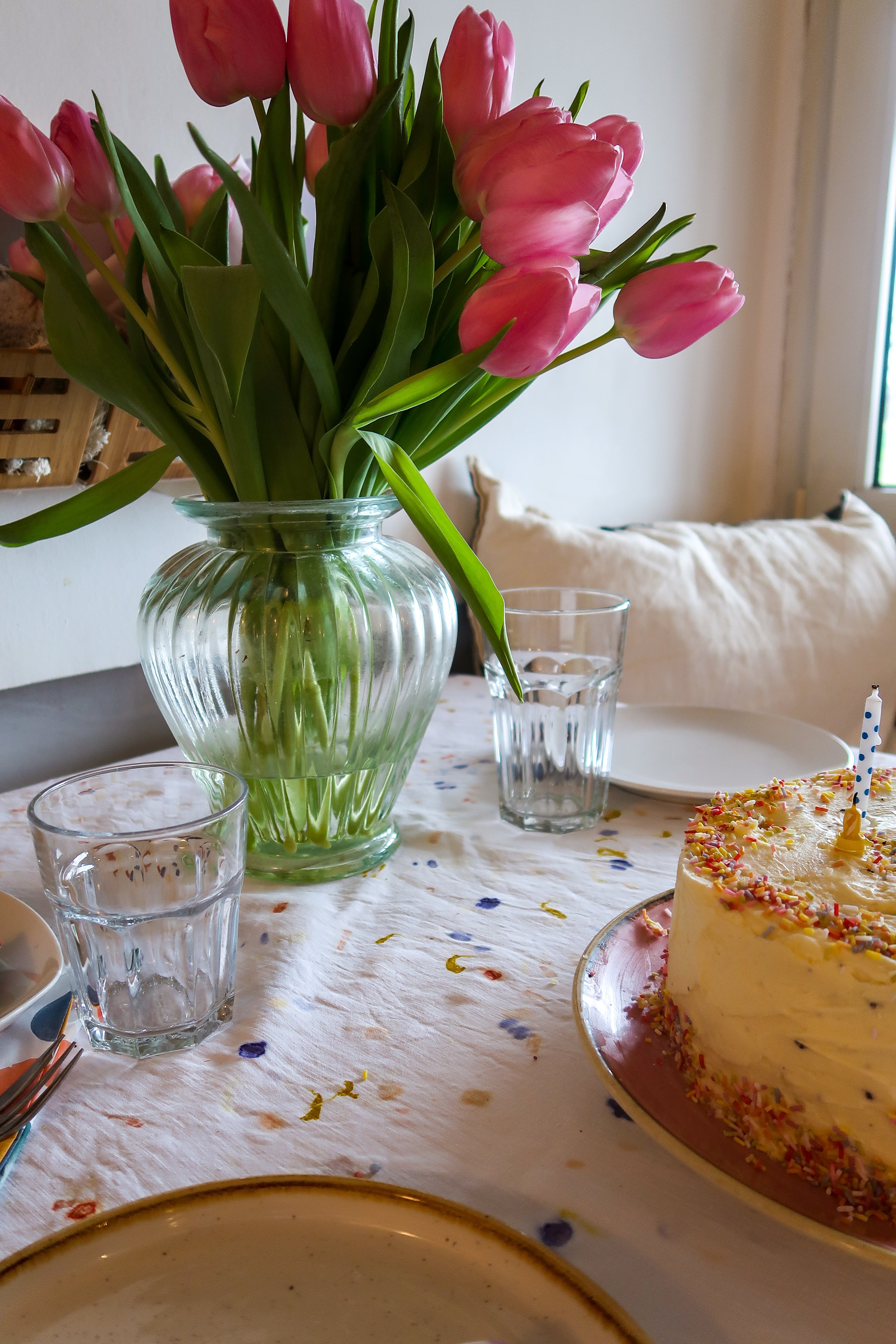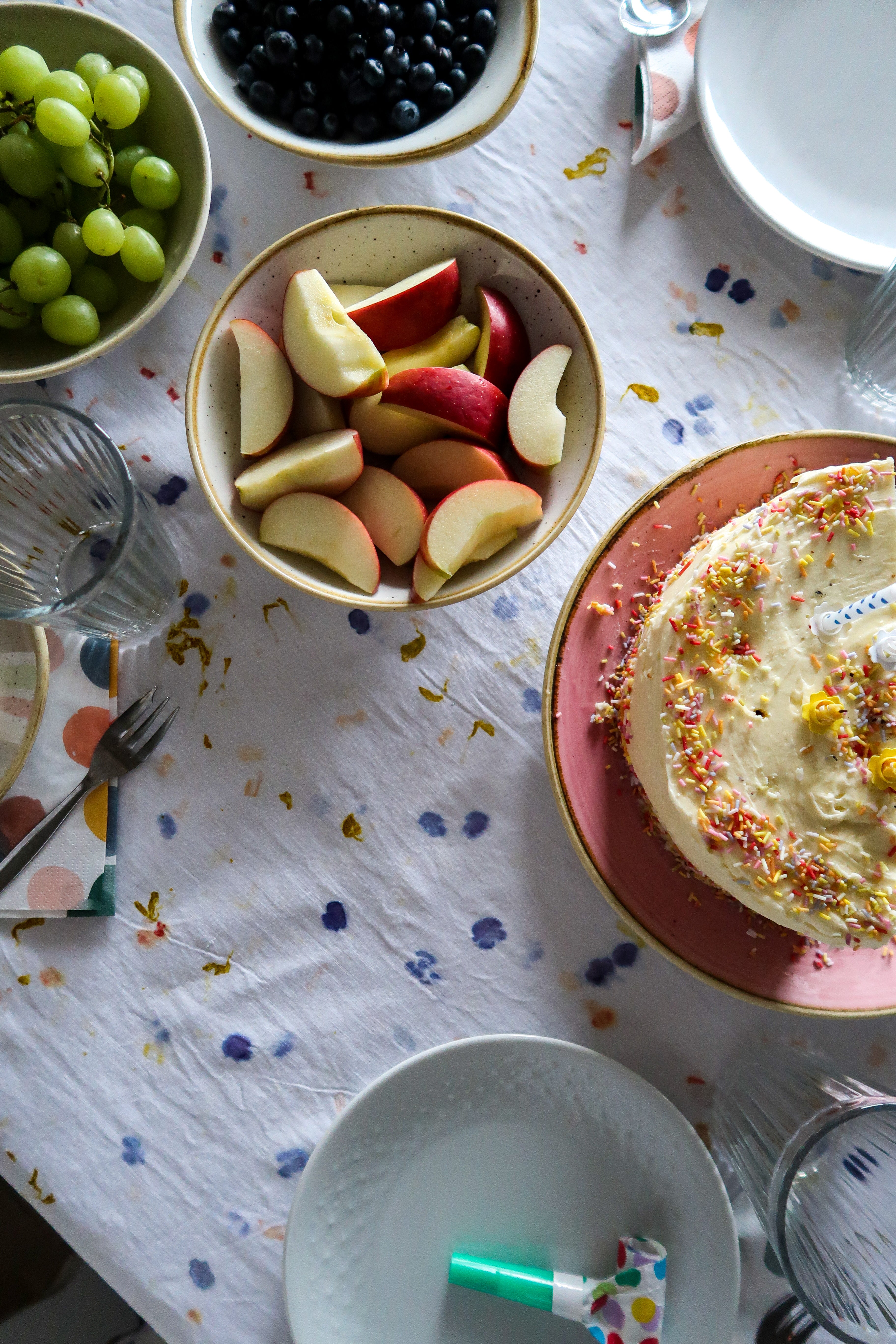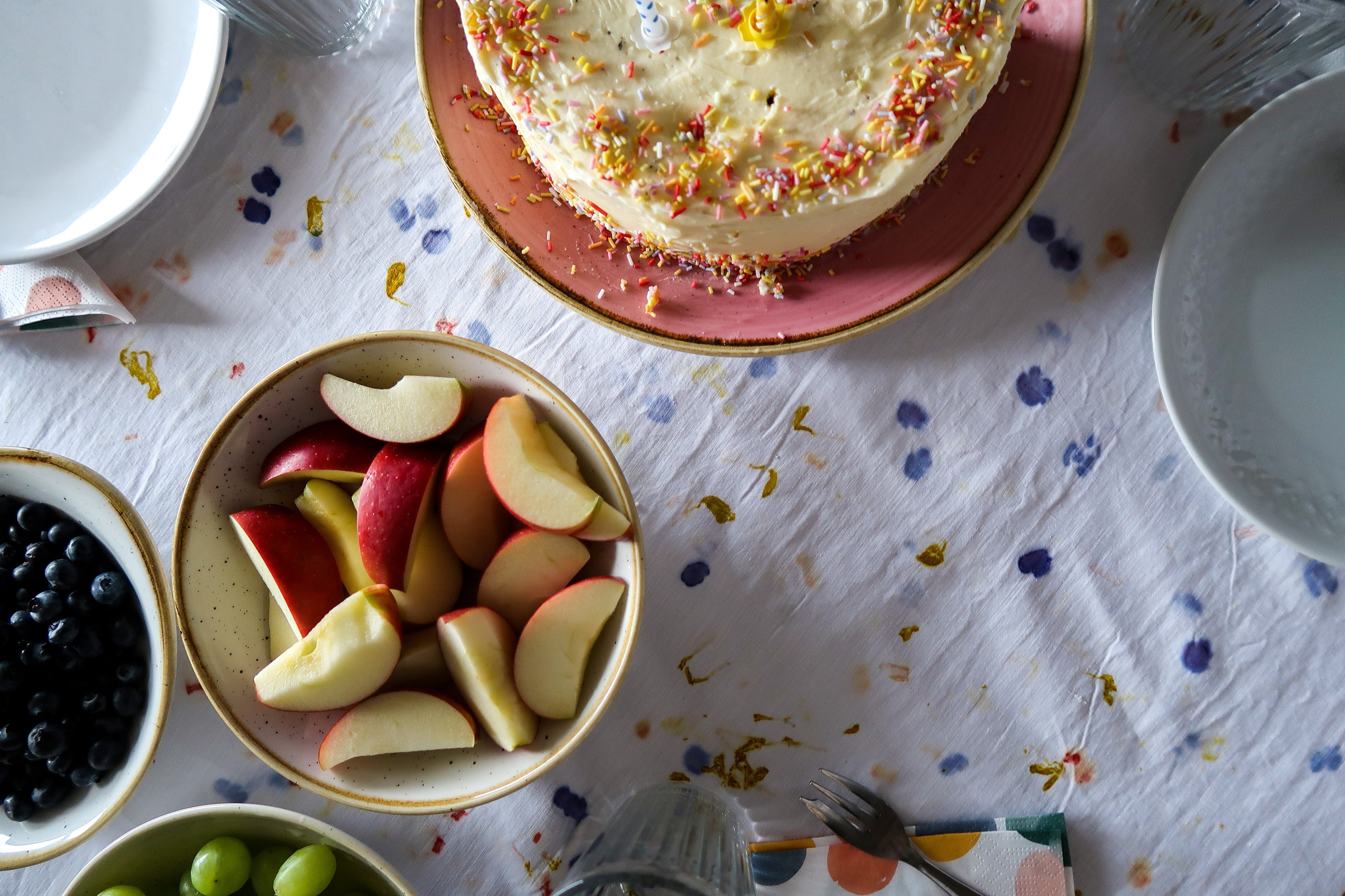 Rinse the table cloth with eco detergent, such as wool & silk detergent. Hang it table cloth up to dry and that’s it! This table cloth will give the perfect backdrop for any birthday table.