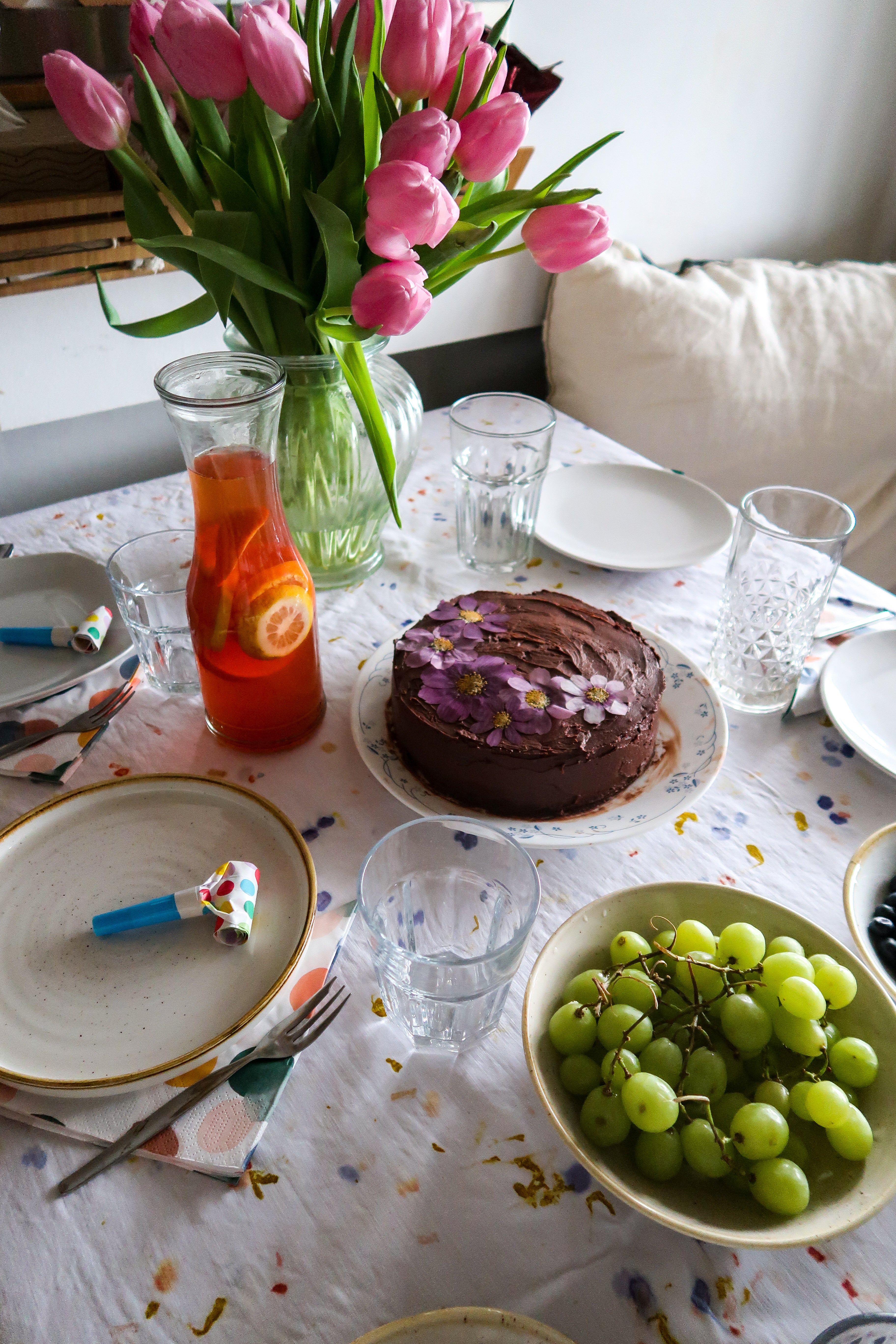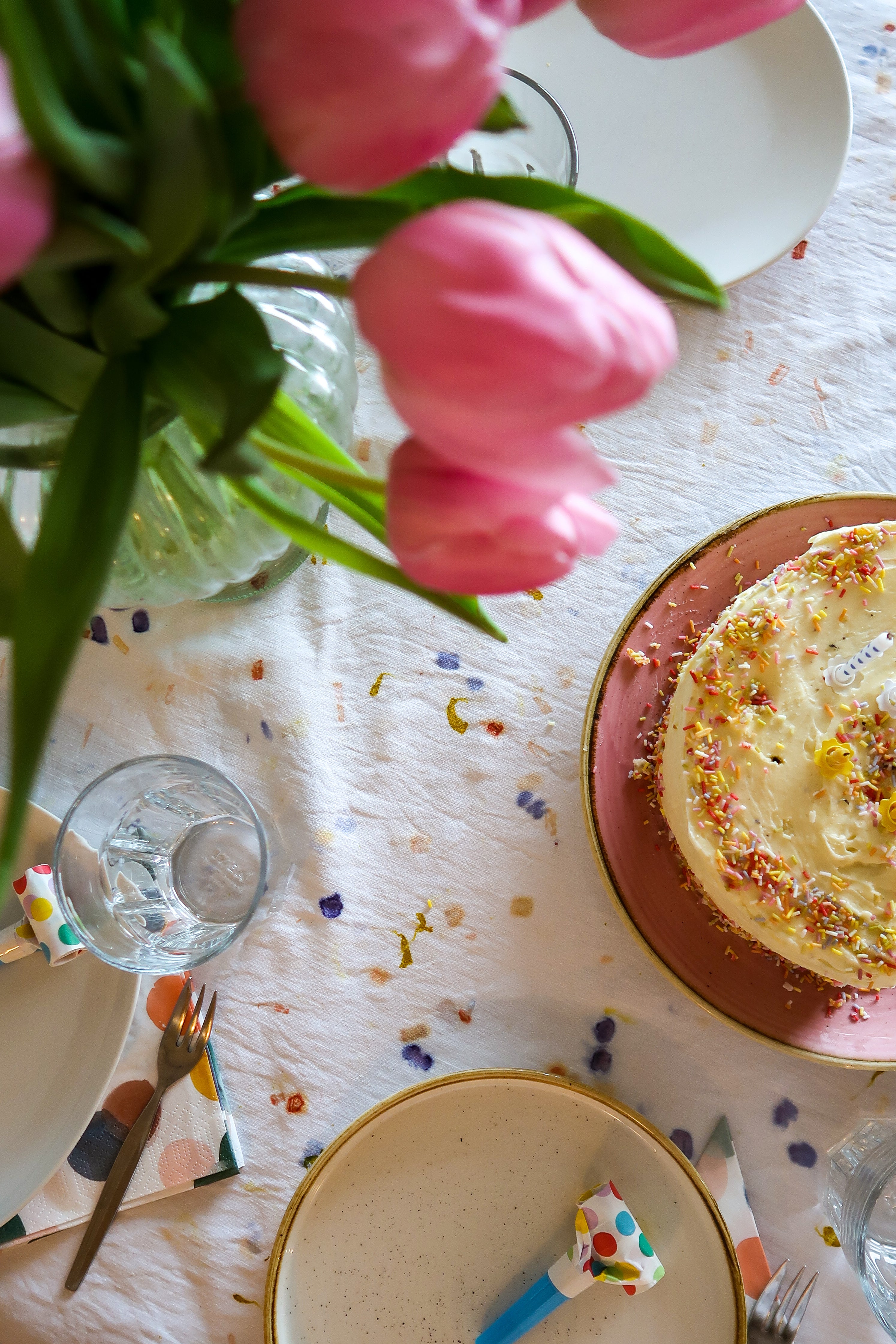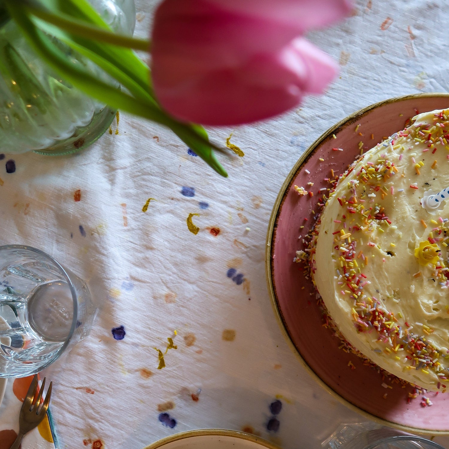 Rinse the table cloth with eco detergent, such as wool & silk detergent. Hang it table cloth up to dry and that’s it! This table cloth will give the perfect backdrop for any birthday table.