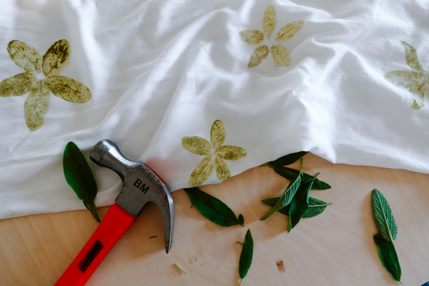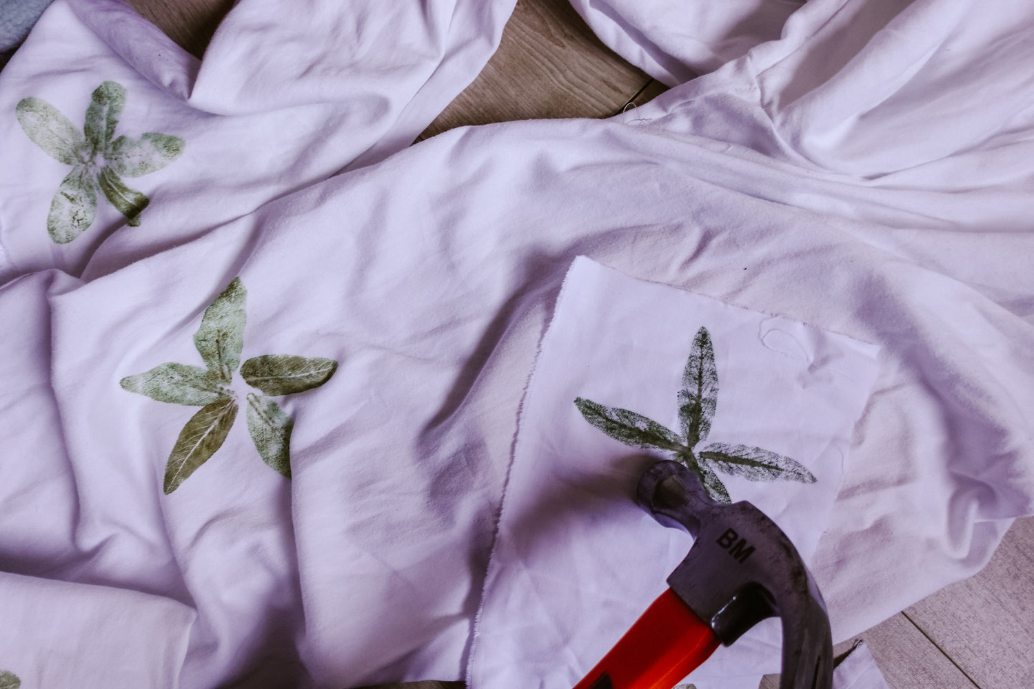 Begin gently but firmly hammering directly over the leaves. Unlike delicate flowers, leaves often require a bit more pressure to fully release their color onto the fabric. Make sure to tap all parts of each leaf - especially around the edges - to ensure the entire shape is clearly transferred. Take your time to work evenly across the surface for the best imprint.
